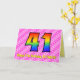 This festive and cheerful 41st birthday greeting card design has a front featuring a large number "41" having a colorful pattern inspired by the look of a rainbow spectrum, on a cheerful light pink and dark pink heart shapes stripes pattern background. The front also features the message "Happy 41st Birthday,", and a customizable recipient name. The inside features an editable birthday greeting message, or could perhaps be cleared and left blank if a message is to be written by hand instead. A customizable birthday card like this might be a fun and happy way of acknowledging somebody’s forty first birthday. [~Z0000418]