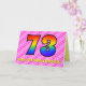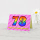 This cheerful and fun 73rd birthday greeting card design has a front featuring a large number "73" having a colorful pattern inspired by the look of a rainbow spectrum, on a fun dark pink and light pink heart shapes striped pattern background. The front also features the message "Happy 73rd Birthday,", and a custom recipient name. The inside features a personalized birthday greeting message, or could perhaps be cleared and left blank if a message is to be written by hand instead. A customizable birthday card like this might be a fun and happy way of acknowledging somebody’s seventy-third birthday. [~Z0000418]
