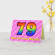 This fun and festive 79th birthday greeting card design has a front featuring a large number "79" having a colorful rainbow spectrum inspired gradient pattern, on a fun dark pink and light pink heart shapes striped pattern background. The front also features the message "Happy 79th Birthday,", followed by an editable recipient name. The inside features an editable birthday greeting message, or could perhaps be cleared and left blank if a message is to be written by hand instead. A custom birthday card like this might be a fun and happy way of sending birthday wishes to somebody who is celebrating their seventy ninth birthday. [~Z0000418]