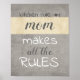 This poster has a kitchen quote humor text typography design mom makes all the rules on distressed gray for wall art decor.