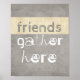 This poster has a whimsical style text quote friends gather here on distressed gray for wall art decor in home or office. Background art copyright Ann Powell.