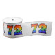 This fun, happy and vibrant ribbon design features the number "72" with a colorful rainbow-inspired gradient pattern, on a light gray colored background. Ribbon like this could perhaps be used when wrapping gifts or presents being given for somebody’s seventy second birthday, or perhaps for a couple’s seventy second wedding anniversary, or some other 72nd event. [~Z0000321]