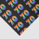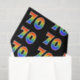 This fun, colorful, vibrant tissue paper design features the number "70" with a multicolored rainbow inspired spectrum gradient pattern, on a black colored background. Tissue paper like this might be used when wrapping presents or gifts being given for somebody’s seventieth birthday, or perhaps for a couple’s seventieth wedding anniversary, or some other 70th event. [~Z0000331]