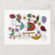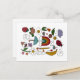 This postcard features random objects in fun colors for that nostalgic 1980's sticker book feel. The cute little illustrations include a strawberry, turtle, fried egg, tulip, leaf, rain cloud, ladybug, sun, chocolate chip cookie, boat, banana, coffee cup, balloon, daisy, yellow pencil, duck or goose, mushroom, star, ice cream cone, butterfly, umbrella, rainbow, envelope, speech bubble with the word "hi", and a carton of milk.
