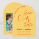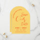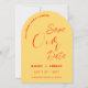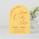 Free drinks and a wedding! A fun retro save the date in bright bold yellow featuring orange typography. A witty and minimal save the date perfect for a fun loving couple looking for a unique and modern summer wedding stationery that matches their vibrant personality.