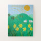 The original and cute childrens illustration on this jigsaw puzzle is painted in a "nieve" sort of style, it's bright and colorful. the picture shows some white and fluffy black faced sheep grazing behind daffodils on the hillside, the sky is blue with fluffy clouds and the sun is shinning. In the background you can see a few leaf covered green trees with in red apples on them. This kids picture jigsaw is easy to put together because the images are painted in nice solid colors with exact outlines. This jigsaw will be enjoyed by all ages.