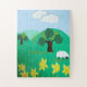 The original and cute childrens illustration on this jigsaw puzzle is painted in a "nieve" sort of style, it's bright and colorful. the picture shows some white and fluffy black faced sheep grazing behind daffodils on the hillside, the sky is blue with fluffy clouds and the sun is shinning. In the background you can see a few leaf covered green trees with in red apples on them. This kids picture jigsaw is easy to put together because the images are painted in nice solid colors with exact outlines. This jigsaw will be enjoyed by all ages.