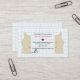 This business card has a fun sewing or alterations design. The background has a blue and white grid for cutting out patterns with a shirt pattern split on both sides. There is a pair of scissors cutting and a pin cushion with some pins in it. You can easily customize the business information in the center.