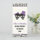 Fun skulls Halloween purple and black wedding menu card, featuring a black skull couple bride and groom on ivory background and a skull pattern border. The groom is wearing a hat and the bride a bow. This modern and contemporary gothic style wedding template design is perfect for a Halloween wedding.