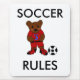 A cool teddy bear in soccer gear and ready to kick a soccer ball.