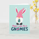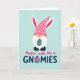 Designed with a tall, vertical layout, this card features a cute gnome-like figure near the top, with a fluffy white beard and a small orange nose. A bright fuchsia pointed hat with white polka dots sits above two long bunny ears that peek out, adding a sweet Easter touch 🐰. The character holds an ornate oval egg filled with swirling bands of teal, purple, pink, green, and yellow, like a little gift being offered with a gentle, friendly care. Beneath the figure, two lines of text are centered: the upper phrase appears in pink with a tiny heart accent nearby, and the lower word is set in textured teal. One letter in the lower word is replaced by a smaller patterned egg that echoes the larger oval the character is holding. The background is a pale aqua field that keeps the focus on the bright hat, ears, and eggs 🌷. The final detail is the contrast between the pink headline and teal word, both sitting neatly under the character on the airy aqua backdrop.