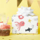 This lovely wrapping paper features a white background with cute cartoon sea creatures including a red seahorse, yellow, black and light blue fishes, a fun red crab, starfish, and some seaweeds.