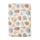 This design features a charming watercolor pattern of pumpkins and jack-o'-lanterns in a soft, muted color palette. The design includes various pumpkin shapes and sizes, painted in gentle shades of orange, cream, and gray. Each jack-o'-lantern has a unique carved face, ranging from happy and friendly to slightly spooky, adding character and variety to the pattern. The pumpkins are arranged on a clean, white background, allowing the delicate watercolor textures to stand out. The overall design is both festive and adorable, perfect for capturing the whimsical spirit of Halloween in a cozy, artistic way.