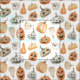This design features a charming watercolor pattern of pumpkins and jack-o'-lanterns in a soft, muted color palette. The design includes various pumpkin shapes and sizes, painted in gentle shades of orange, cream, and gray. Each jack-o'-lantern has a unique carved face, ranging from happy and friendly to slightly spooky, adding character and variety to the pattern. The pumpkins are arranged on a clean, white background, allowing the delicate watercolor textures to stand out. The overall design is both festive and adorable, perfect for capturing the whimsical spirit of Halloween in a cozy, artistic way.