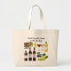A stylish tote bag featuring vibrant illustrations of wine bottles, grapes, and a playful message.