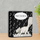 This mini binder has a black background with white music scattered over the front, back and spine with a smiling winking white cat prancing across the keys of a piano. Customize the text with the template in the white oval.