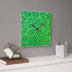 Printed with bright green and blue squares, with light yellow background and black traces. An effect similar to well spaced bricks upon one background image. The green square converges from light green to a bluish hue; upon the yellowish background the squares can cause the illusion that they are floating; depending on the position of looking and ambient lighting.