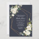 A modern, elegant funeral or memorial service invitation featuring white watercolor flowers, copper geometric design elements on navy blue, with a green watercolor texture. Copyright Elegant Invites, all rights reserved.