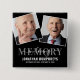 Memorial funeral button featuring a stylish black background, 2 photos of the person who has sadly passed away, the sympathy saying "in loving memory", their name, and birth/death dates.