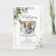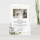 Funeral memorial program featuring on the front a photo of the deceased, their name, dates, the memorial venue, date of the event, and elegant gold frame with watercolor greenery. On the inside is an obituary, and order of service; and on the back another photo, a thank you note and the second venue for after the funeral. For further customization, please click the "customize further" link and use our design tool to modify this template. If you need help or matching items, please contact me.