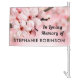 A funeral procession car flag to attach to the hearse and the cars that follow, on a pink blossom design and the text "In Loving Memory ADD NAME".