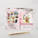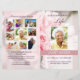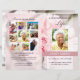 Funeral program for a woman with soft pink carnations background. Includes space for funeral service text such as an obituary, order of service, poems or readings. This template also includes a large photo on the front page, a photo collage on the back page and three extra photos above the example obituary on the inside. All text is easy to edit and fully customizable and photos can be resized, deleted or more added if needed.