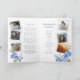 Funeral order of service double-sided floral blue delphinium watercolor art program with blue flowers and green leaves on white. Simply replace the sample text and instant style white framed photo holders and the soft photo frame on the front with your own special photos and information details. Original botanical hand panted watercolor delphinium painting and design by Sarah Trett for www.mylittleeden.com (photos are just placeholder images for you to replace with your own).