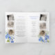 Funeral order of service double-sided floral delphinium watercolor art program with powder blue flowers and green leaves on white. Simply replace the sample text and instant style white old fashioned framed photo holders and the soft photo frame on the front with your own special photos and information details. Original botanical watercolor delphinium painting and design by Sarah Trett for www.mylittleeden.com (photos are just placeholder images for you to replace with your own).