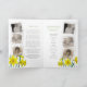 Funeral program order of service double-sided floral spring yellow daffodil botanical watercolor art funeral program. Simply replace the sample text and instant style white framed photo holders and the soft photo frame on the front with your own special photos and information details. Original hand watercolor painting botanical art yellow daffodils and design by Sarah Trett for www.mylittleeden.com (the photos are just placeholder images for you to replace with your own).