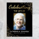 Funeral photo welcome sign featuring a stylish black background that can be changed to any color, a photo of your loved one, a scattering of gold glitter, their name and dates.