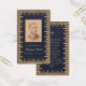 A memorial prayer card with a vintage air. It has a vintage gold lace-like frame and leather-like navy blue background. There is a vintage placeholder photo on the front and a prayer on the back. The text is golden, the background is navy blue, the name is written in an elegant calligraphic script. On the back, there is a gold cross above the prayer.