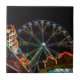 Striking photograph of an amusement park lit up at night with a large ferris wheel at the center.