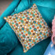 This funky retro mid mod style patterned throw pillow features circles of tan, white, two shades of orange, teal blue, and brown. This is sure to be an eye catcher on your bed or sofa!
