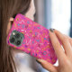 Make your phone stand out with this funky 80s Memphis style phone case!. This design features blue, purple, white, yellow, and black squiggles, triangles, diamonds, and circles on a bold pink background.