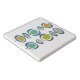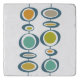 This fabulous mid century modern trivet features two sets of abstract hanging circles in the colors of turquoise blue, orange, gold, avocado green, tan, and blue. This will make a colorful addition to your kitchen counter!