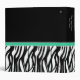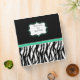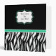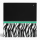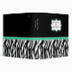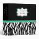 Cute black, aqua blue, white zebra print binder features fun stripe pattern on front and back with scroll frame on front. Add your custom text to the front and spine.