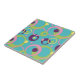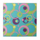 A bright blue background is adorned with a funky pattern of circles, dots, and rings in a variety of vibrant colors, including pink, green, purple, and yellow. This tile can be framed to create a trivet or placed inside a wooden gift box lid. Tiles without a frame will also fit inside the large gift box to create a matching set.
