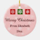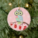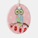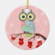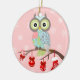 The owl in shades of teal and its body has a pink rose with lime green leaves and white circular pattern in light teal. The wings are in chocolate brown with white pattern. The ornaments are 2 red balls, candy cane, and a red sock on the branch. The background is snowflakes in the pink. The back of ornament is snowflakes in pink and the texts are in chocolate brown and they're customizable. This is a digital illustration.