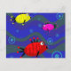 Funky cartoon fish swimming along against a wavey blue background and retro bubbles