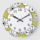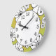 This contemporary floral decorative wall clock features black and white flowers arranged in a funky floral design. Background is yellow green with an orange halftone pattern.