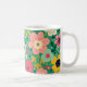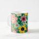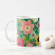 A cute floral mug with a pattern of simple colorful flowers and leaves in several colors on a green background. Whether you're looking for a gift for a friend or just want a new mug for yourself, this is the perfect choice.