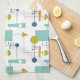 Add a pop of color to your kitchen with this fabulous geometric line and shapes "flow chart" retro pattern kitchen towel. It features the bright and bold colors turquoise, blue, green, orange, and black.