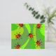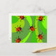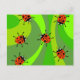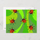 Funky cartoon red ladybugs scuttling around against a retro green swirly background design.