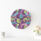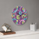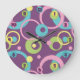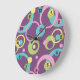 A vibrant purple background is adorned with a funky pattern of circles, dots, and rings in a variety of bright colors, including pink, green, blue, and yellow.