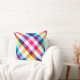 A 20” x 20” throw pillow featuring a colorful plaid pattern design in rainbow colors.