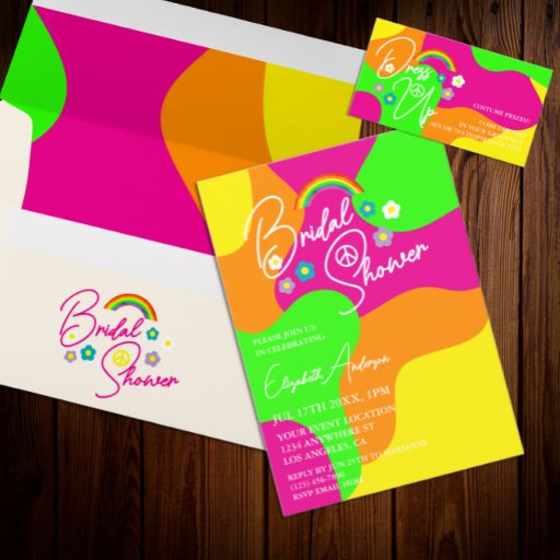 Bold and colorful retro bridal shower with flowers, rainbow, and peace sign