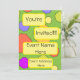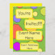 Invite your guests with this personalized funky and colorful retro 60's/70's themed invitation! Full of orange, yellow, blue and purple circles on a lime green background.