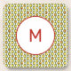 This monogrammed coaster is decorated with a cool retro style pattern in olive green with bead-like oblong shapes set at intervals along straight vertical lines. Each color may be edited in this special graphic for a custom look.