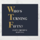 Celebrate your 50th birthday in style and with humor! On a navy blue background, the gold and off white typography at the top reads "Who's Turning Fifty?" with the WTF larger and in gold. Underneath, you can customize the Happy Birthday message with your own name. Unique, cheeky and perfect for the big birthday celebrations!