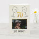 Celebrate the big 70 with a laugh! This humorous 70th birthday card features elegant wine glass outlines, a bold gold '70', and the playful 'SO WHAT!' phrase. The customizable photo frame lets you add a personal picture, making it a unique and memorable card for friends or family embracing their milestone birthday with a smile. Perfect for those who appreciate a bit of cheeky humor on their special day, ensuring your message and photo look vibrant and striking. Make their special day unforgettable!
